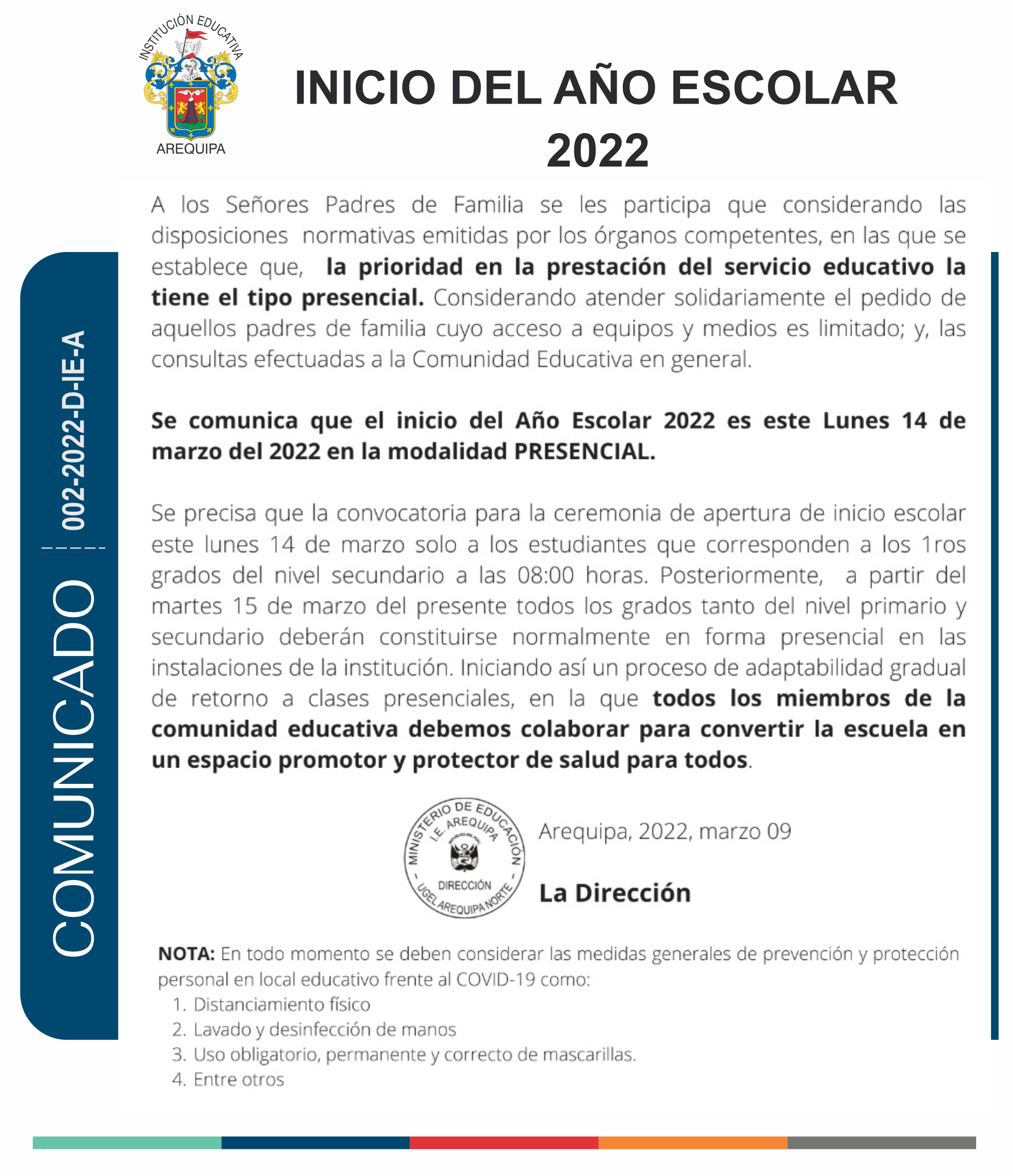 La Dirección de la Institución Educativa de señoritas «AREQUIPA», pone en conocimiento a los padres de familia, señoritas estudiantes y público en general, que la inauguración y apertura del año escolar 2022 se llevará a cabo el día lunes 14 de Marzo con la asistencia solo de estudiantes del primer grado de secundaria.